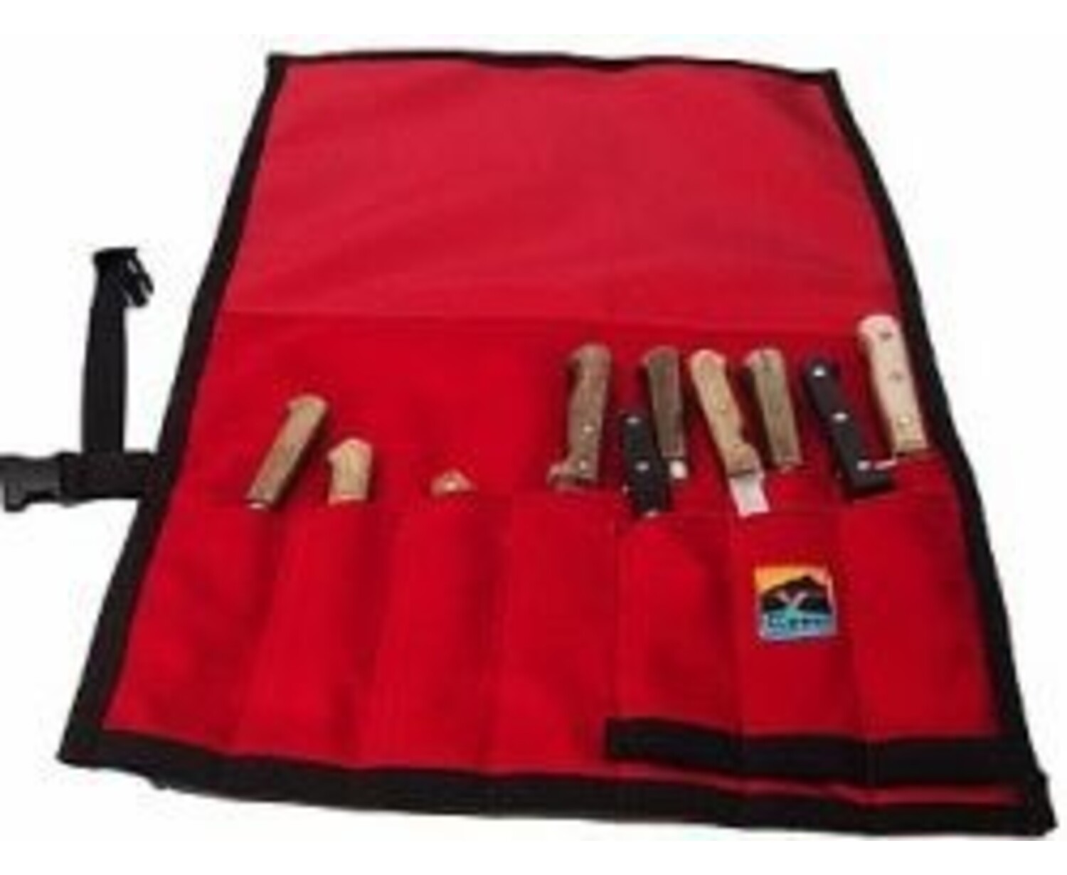 Our ballistic nylon roll up bag for your camp kitchen not only organizes your cutlery, it keeps your hands safe! Featuring 10 pockets for housing an array of sharp knives, it rolls up neatly and closes into a tight bundle.