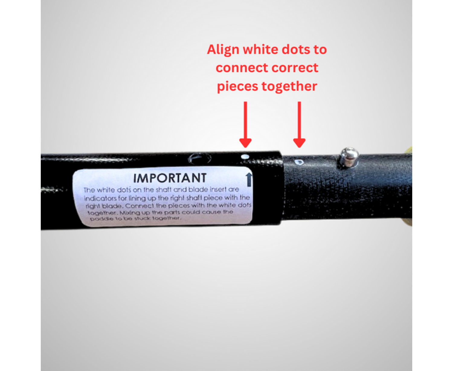 Important: The white dots on the shaft and blade insert are indicators for lining up the right shaft piece with the right blade. Connect the pieces with the white dots together. Mixing up the parts could cause the paddle to be stuck together.