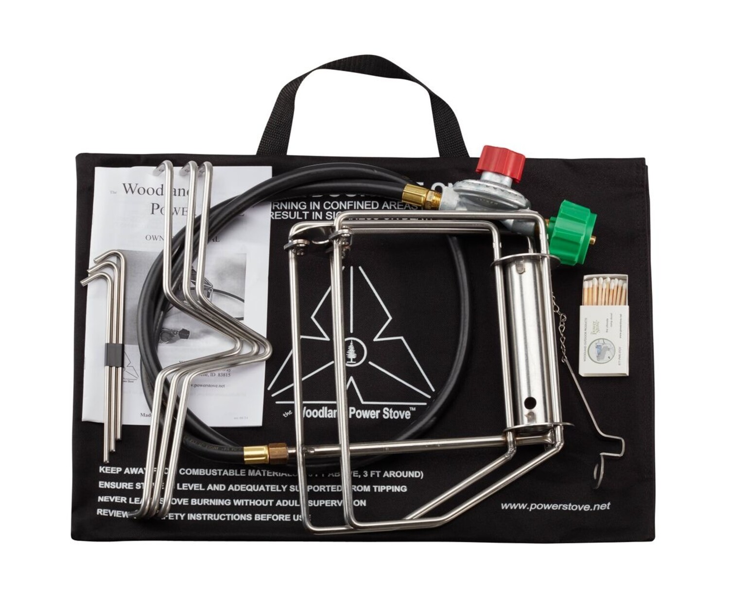 The Woodland Power Stove is the perfect take-along camp stove. Supports the largest pot or skillet, puts out 5,000 to 65,000 BTU/hr and collapses down to a mere 12" x 12" x 2-1/2"!