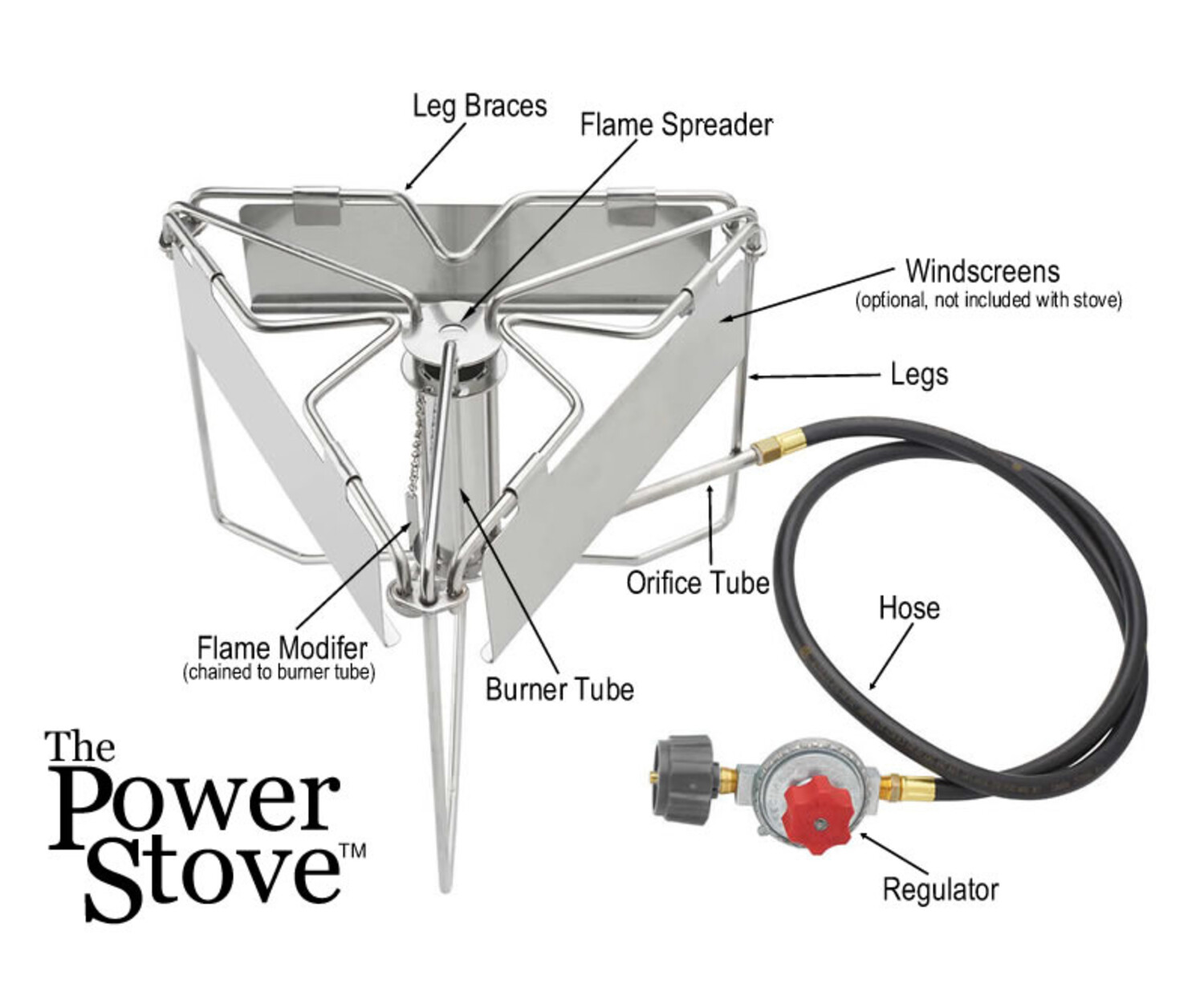 CloseThe Woodland Power Stove™ is the only all-stainless, collapsible, high output propane burner available. Its 65,000 BTU/hr output is possible through a revolutionary patented burner tube design, similar in principle to a rocket engine. With its unique folding legs, it will collapse to the size of a typical phone book for easy storage. The Power Stove, either alone or combined with the optional accessories, will surely enhance your outdoor experience!