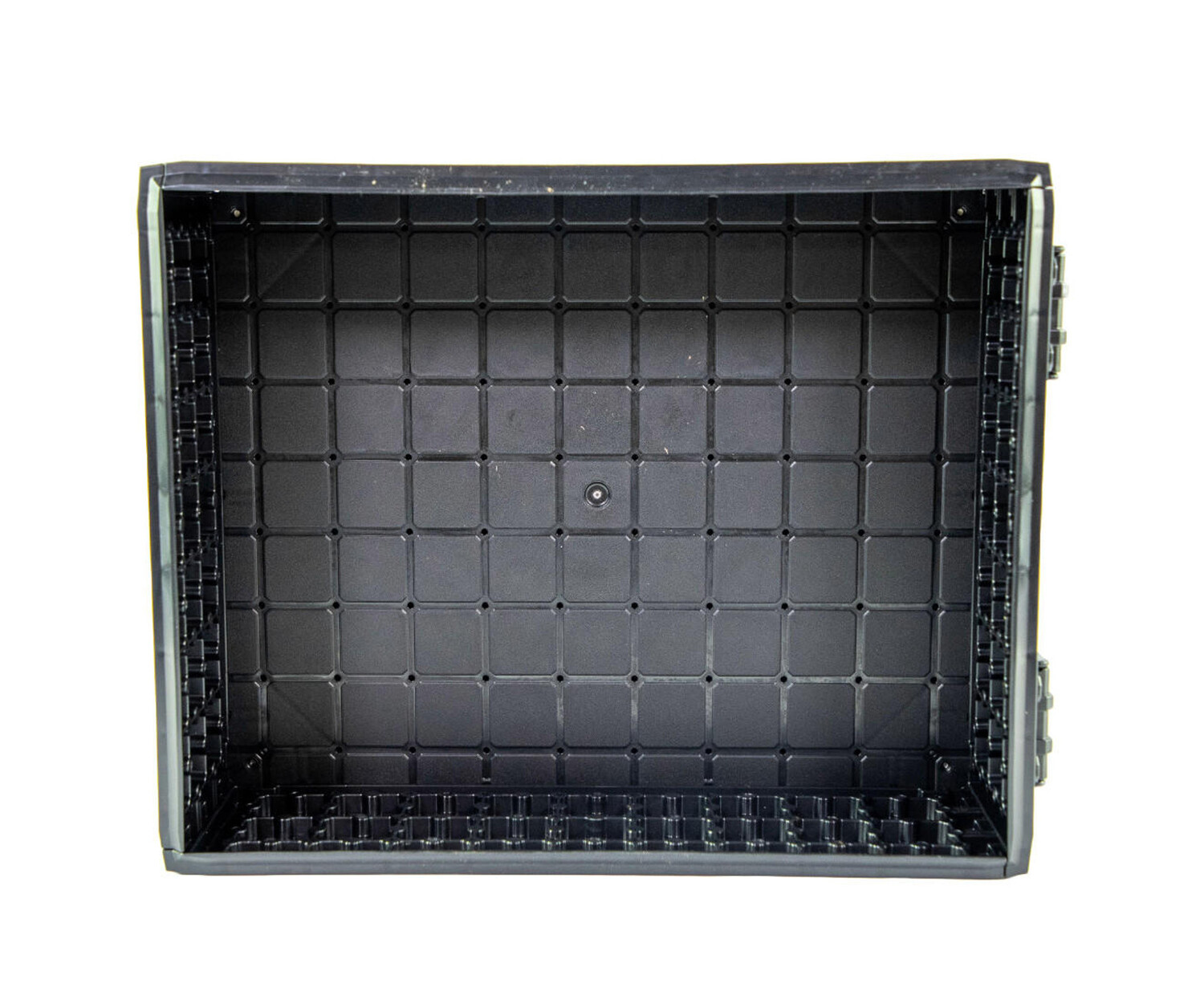 The design of the ShortStak inherits many of the same features found on the BlackPak Pro. From lightweight injection molded parts and tongue and groove assembly, to the GridLoc mounting platform found inside and outside the crate, making it obvious they were made for each other. An addition of heavy-duty hinges and support straps were critical to restrict any overtravel of the larger top compartment to prevent damage to your BlackPak. Overall, the length and width dimensions of the ShortStak will match the corresponding BlackPak. The interior depth of the ShortStak will be 4.25 inches across all three sizes.