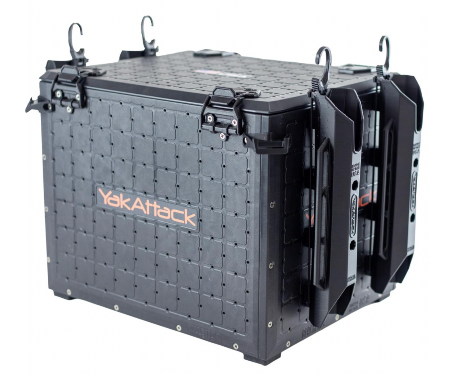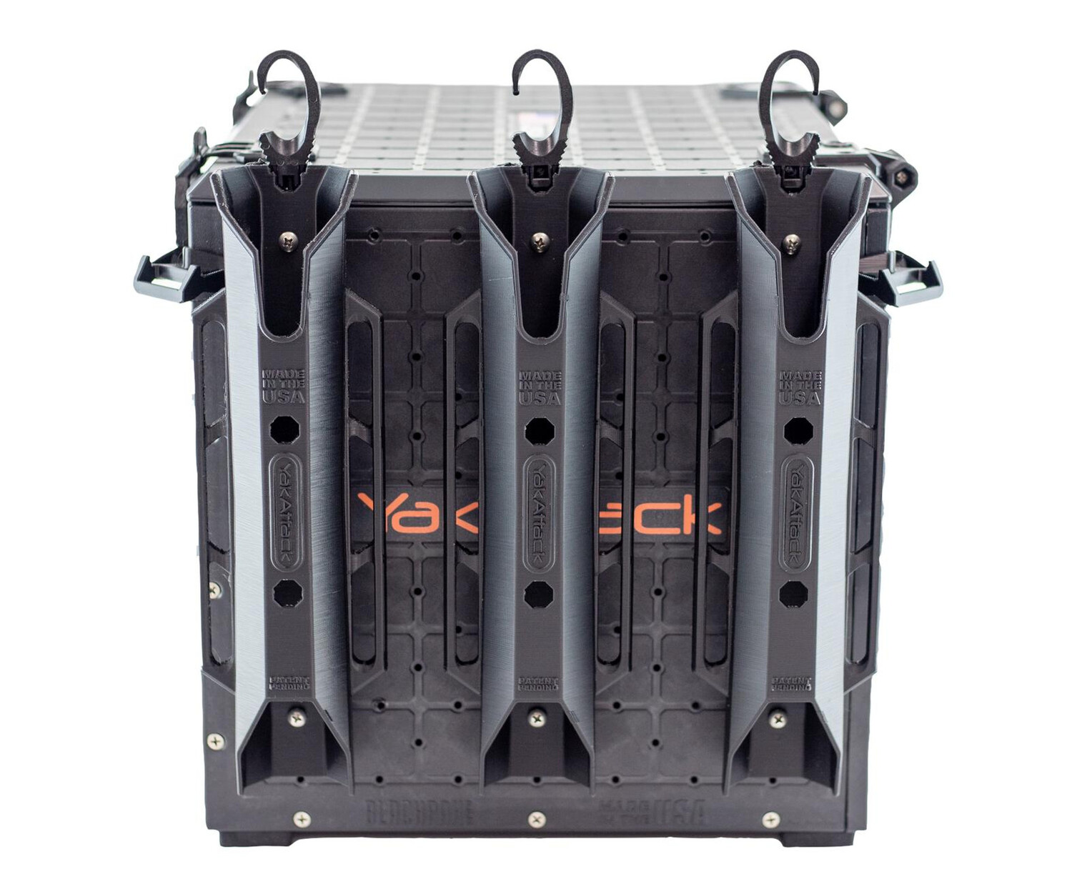 Rubber feet offer noise dampening and isolation, while Omni corner brackets enable multiple hold-down methods. They are designed as attachment points for YakAttack OmniHooks (four of which are included), generic hooks, carabiners, or simple bungee.